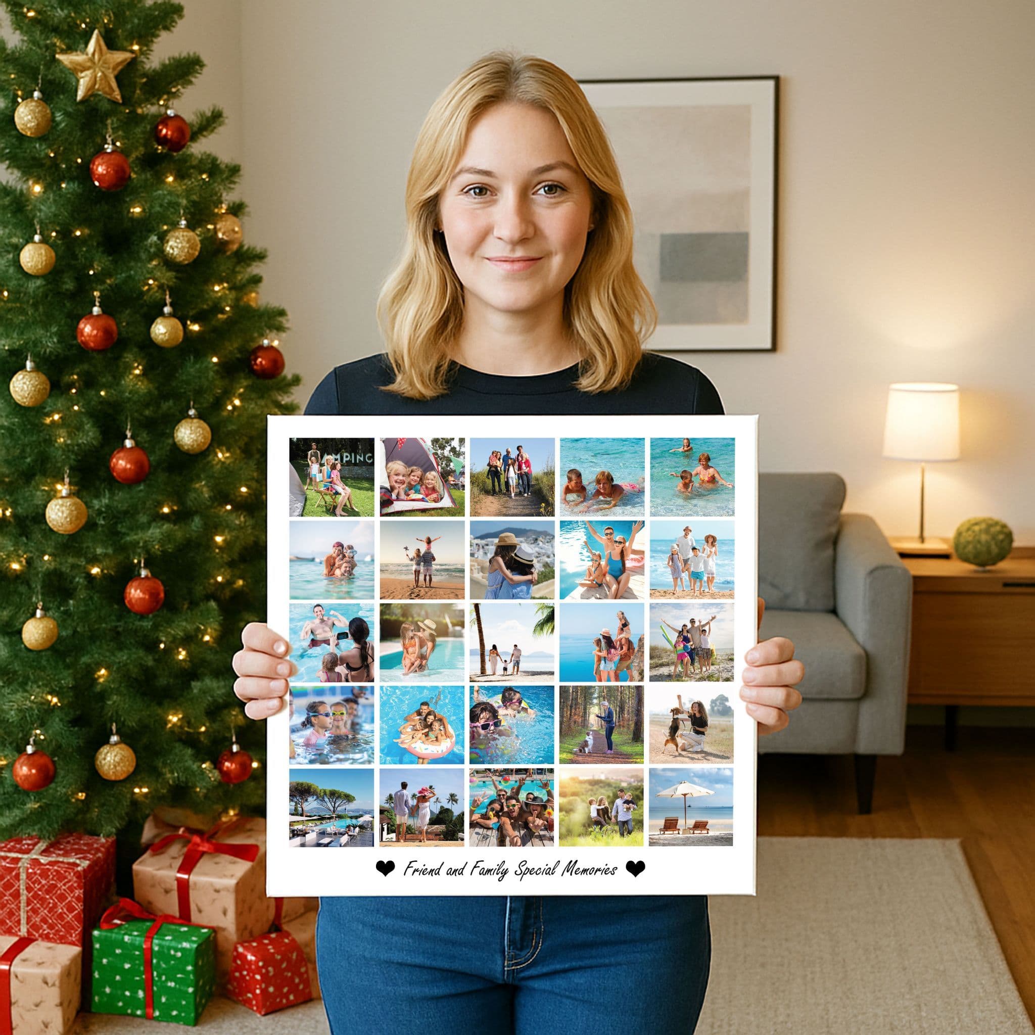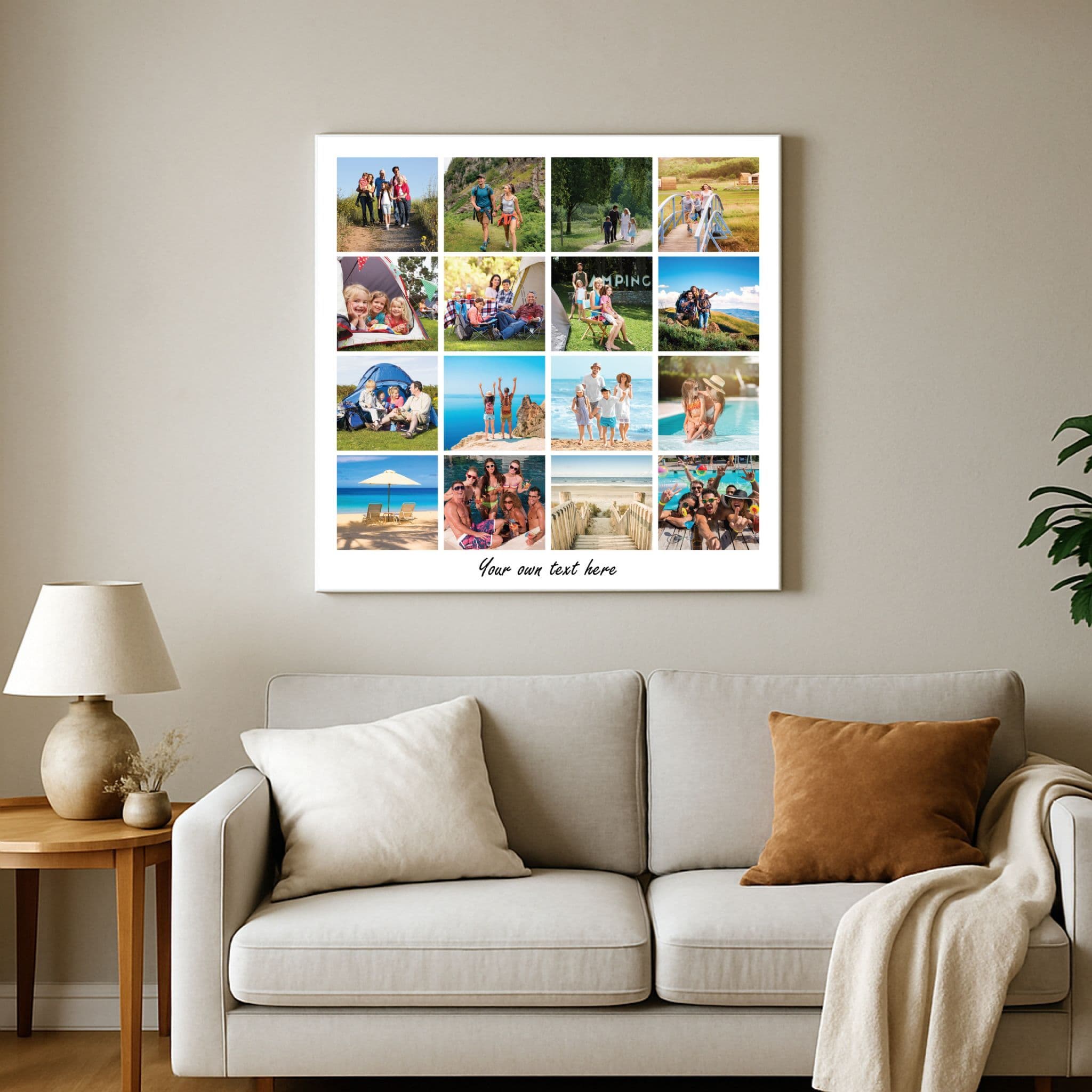 Create your own personalized photo collage canvas featuring between 9 and 30 of your favorite pictures! Perfect for showcasing family holidays, friendship memories, weddings, or everyday moments. Each collage is custom-designed in a clean modern grid layout and printed on high-quality canvas.