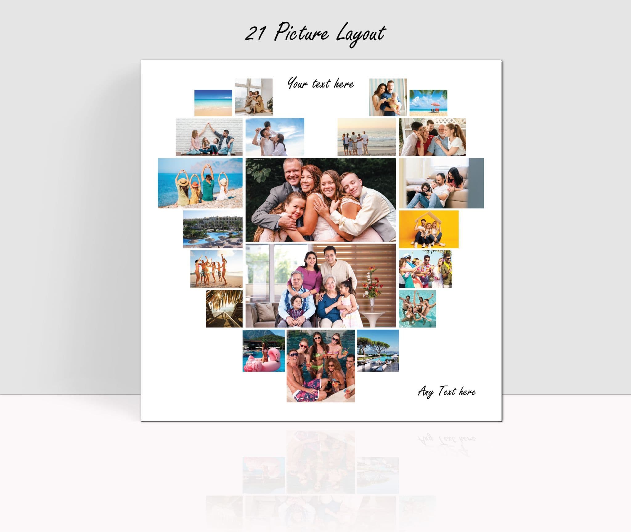 Create a one-of-a-kind, personalised Valentines heart-shaped photo collage on a stunning canvas print. Featuring between 20 and 60 of your favorite photos, this custom keepsake beautifully showcases your memories in a unique and heartfelt design. Ready to hang and perfect for gifts or adding a personal touch to your home decor. Upload your pictures and let us craft your perfect piece of wall art!